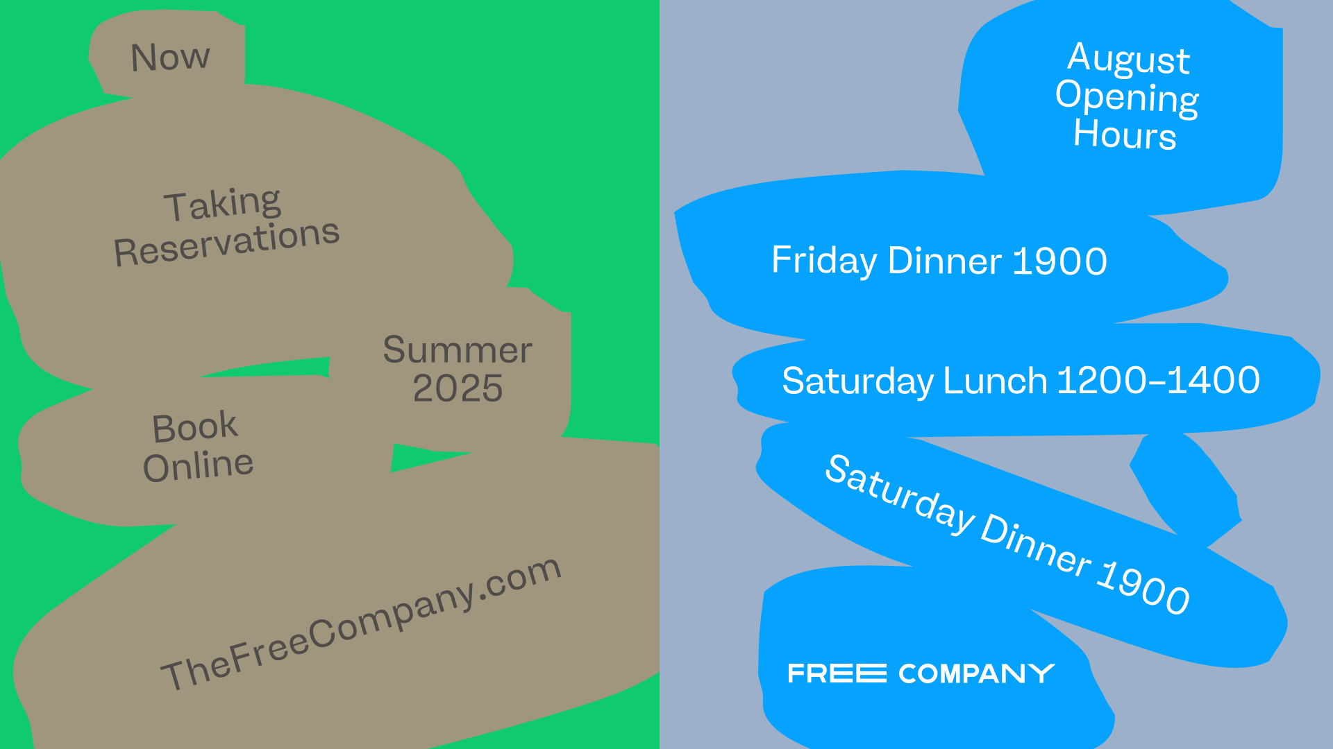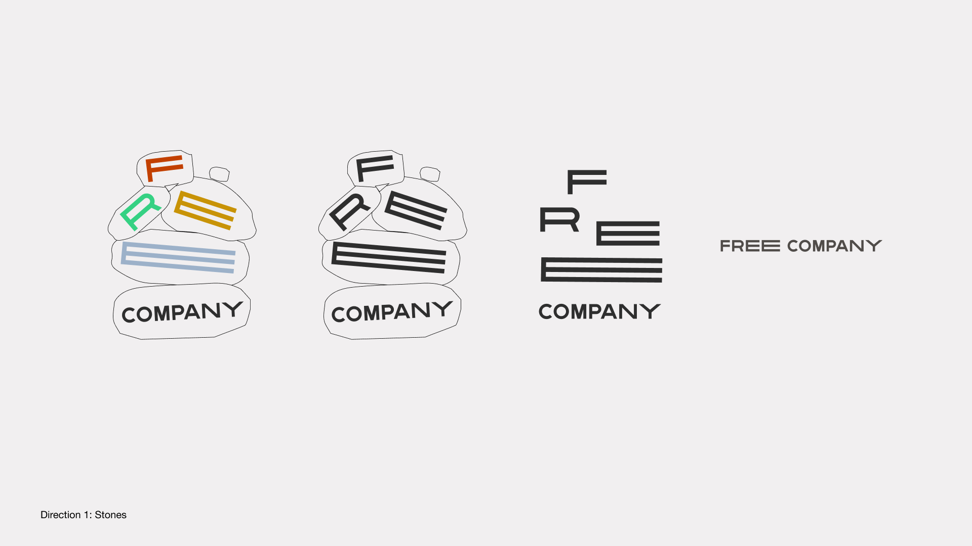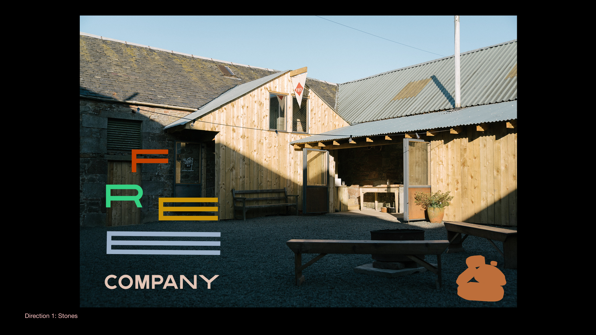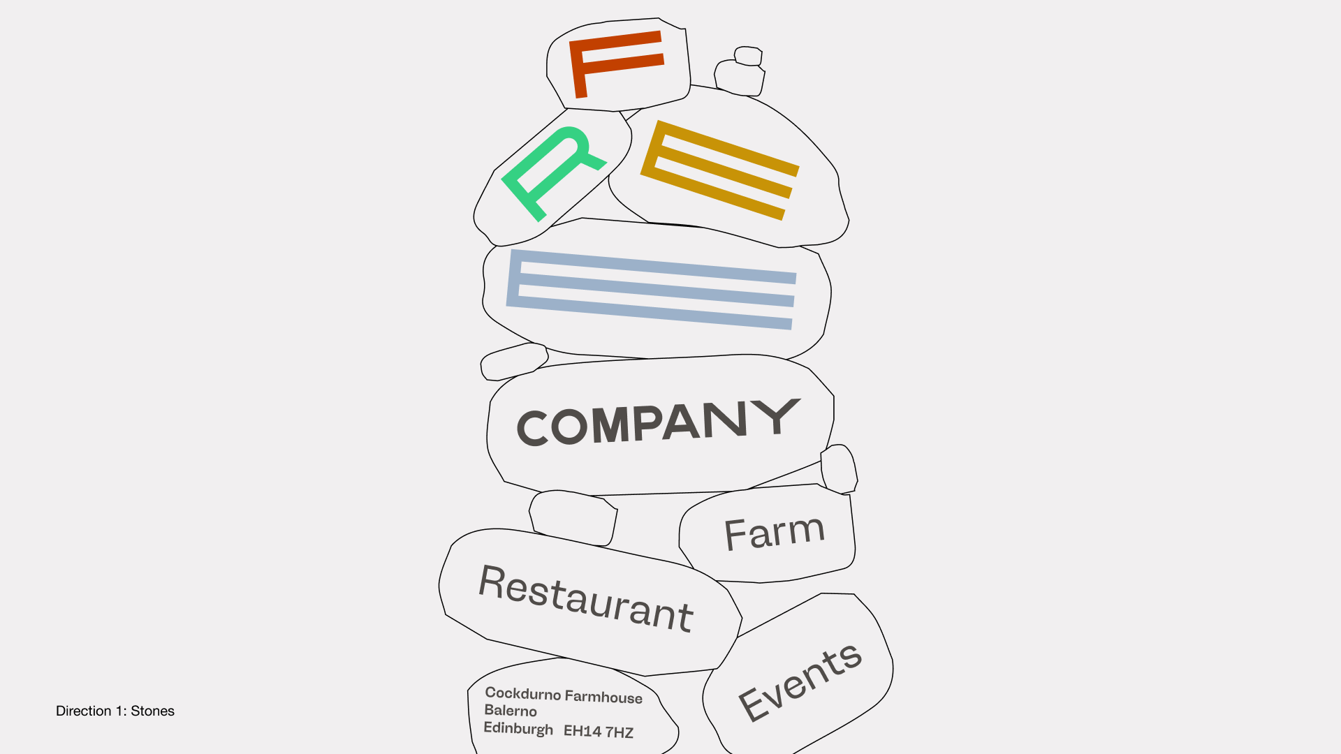 Unfinished identity concept for a regenerative farm and restaurant in Scotland called The Free Company, run by brothers Angus and Charlie Buchanan-Smith. The design is inspired by the farm buildings' stone architecture.